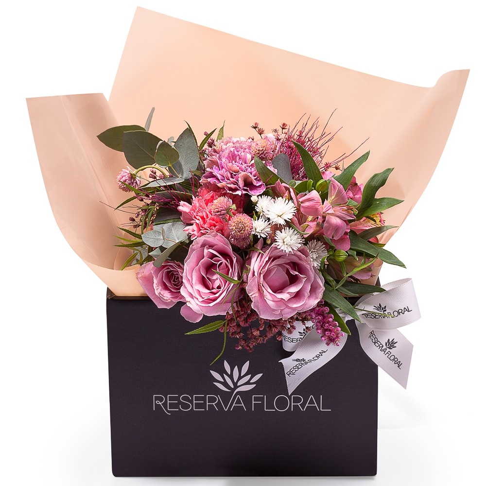 Rosas cor de rosa, Alstroemérias e outras flores delicadas se unem em um arranjo encantador, perfeito para uma lembrança especial. A combinação de cores e texturas é realçada por um vaso cúbico com acabamento de folhas, criando um presente sofisticado e memorável. Utilizamos flores frescas e priorizamos a qualidade e o design, garantindo um presente que expressa seus sentimentos com beleza e elegância. Havendo necessidade de alterações, somente sob sua aprovação.