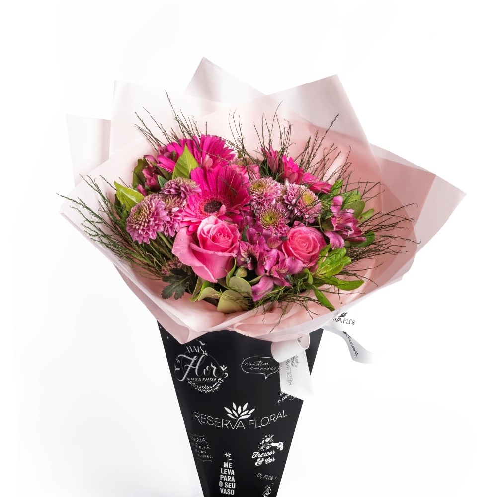 Um arranjo que celebra a beleza em sua plenitude: Rosas, Gérberas, Alstroemérias e Dekkorar, um quarteto de flores nobres, cuidadosamente selecionadas para compor um buquê de doze flores exuberantes, adornadas por folhagens que realçam sua delicadeza. A natureza, com sua paleta mutável, pode nos convidar a reinventar a composição, mas não se preocupe. Mesmo que algumas espécies precisem ser substituídas, a essência da beleza e o volume floral serão mantidos, com um design que honra a sua escolha.